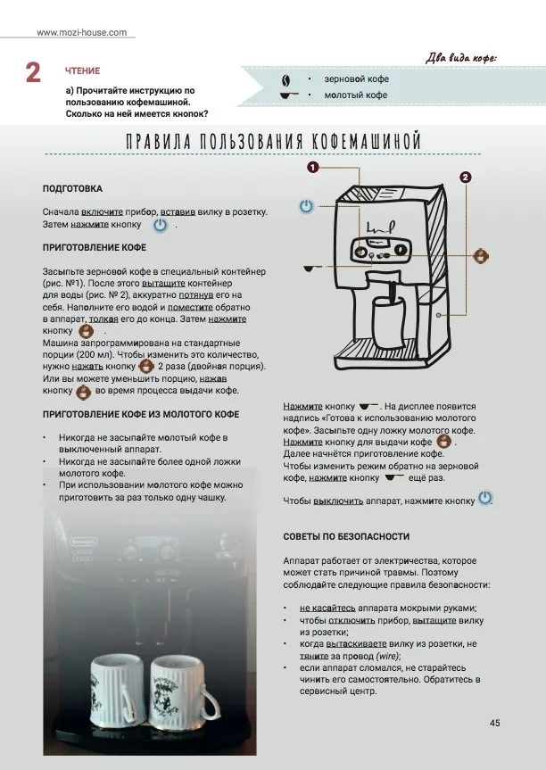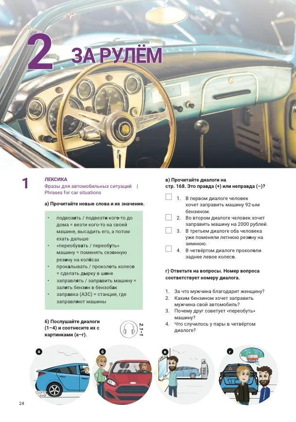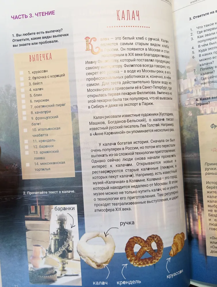 O livro didático é composto por 10 seções. Cada seção tem 4 lições, sendo que a cada quarta lição, há um teste para repetir o conteúdo abordado e um artigo que apresenta aos alunos a cultura russa.