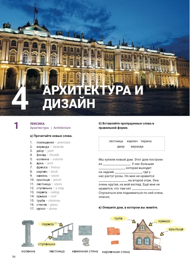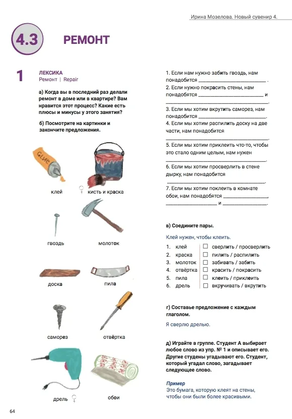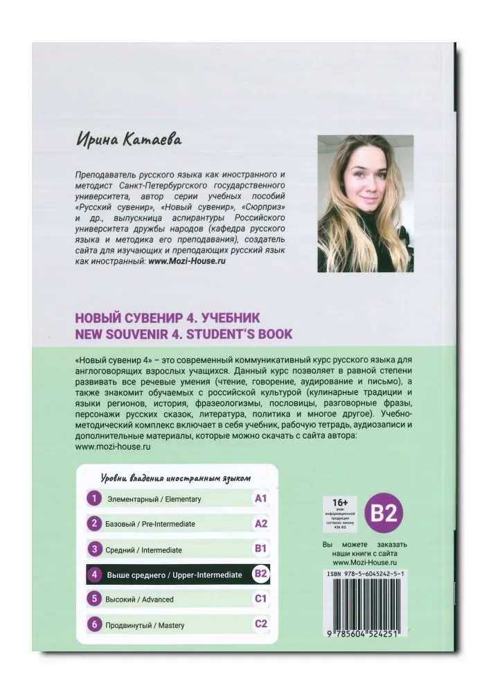 O complexo educacional e metodológico “Novo Souvenir 4” inclui um livro didático, um caderno de exercícios, materiais de áudio e materiais adicionais que podem ser baixados do site do autor. Este curso é destinado a adultos falantes de inglês que já falam russo no primeiro nível de certificação (B1) e desejam aprimorar sua proficiência no idioma para o segundo nível de certificação (B2). Este complexo educacional e metodológico é recomendado para uso em aulas individuais ou em grupo, sob a orientação de um professor falante de russo.